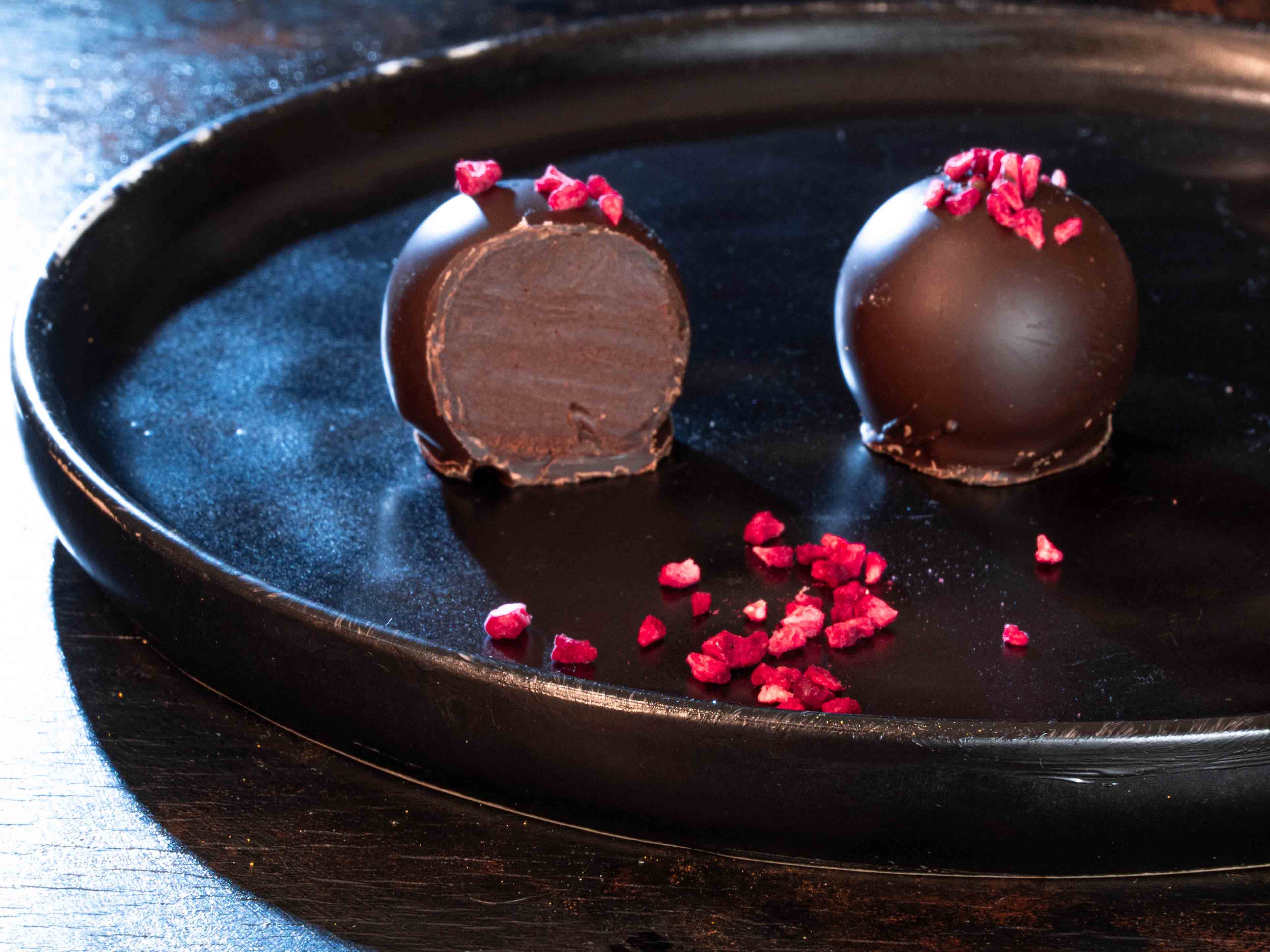 Конфеты "Малиновый трюфель" не содержат сахара и глютена, поэтому насладится ими могут все: те, кто считает себя абсолютно здоровым, и те, кто придерживается большинства диет, и те, кто страдает диабетом и большинством аутоимунных заболеваний. Вы не могли есть конфеты, потому что вам было нельзя? Малиновый трюфель - это настоящий подарок! Вам их можно! Истинные ценители шоколада, всегда первым делом спрашивают конфеты с малиной. Поскольку именно эта ягода помогает раскрыть тонкие нотки темного шоколада. Малиновый трюфель особенно хорош к благородным алкогольным напиткам, особенно к винам из Бургундии. В начинке трюфеля: горький шоколад, жирные сливки 33%, сироп аллюлозы, сливочное масло, сублимированная малина, и натуральные специи. Все наши кето-трюфели сделаны вручную, только из настоящего высококачественного шоколада!